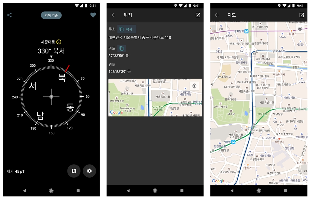 화면 전환을 통해 현재 위치의 위도·경도·주소 정보까지도 지도와 함께 확인할 수 있어, 단순한 나침반 기능 이상으로 활용도가 넓습니다.