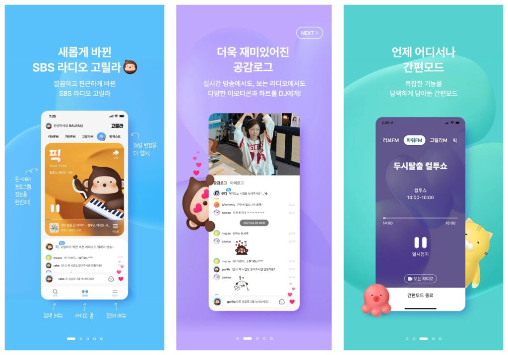 | SBS 고릴라 | 보이는 라디오, 알림 기능, TV 연동 | 영상 청취 가능, 사용자 편의 기능 풍부 | 데이터 및 배터리 소모 큼 |
